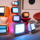 ブラウン管テレビと丸窓、ソファが並ぶレトロポップ平和島の一角